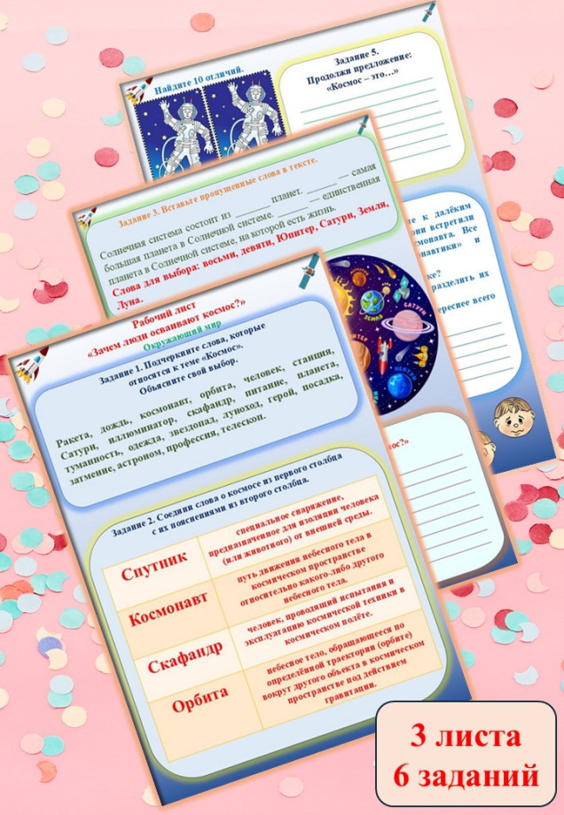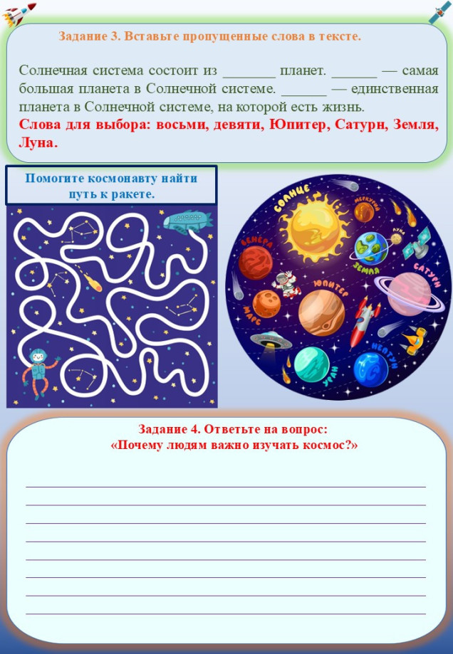 Материал способствует развитию логического мышления, внимательности и умения работать с информацией. Разработка включает в себя задания на сопоставление, выбор правильного ответа, заполнение пропусков, а также небольшое творческое задание, стимулирующее детскую фантазию. Использование рабочего листа позволит не только закрепить полученные знания, но и расширить кругозор первоклассников, сформировать у них интерес к науке и технике, а также воспитать чувство гордости за достижения отечественной космонавтики.