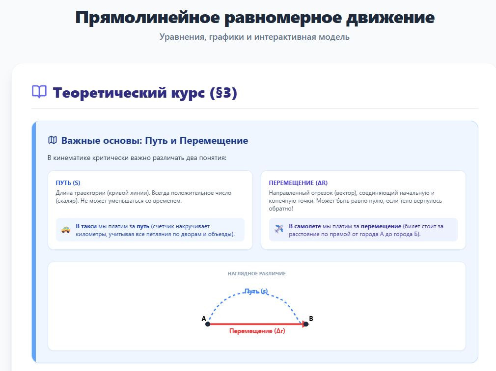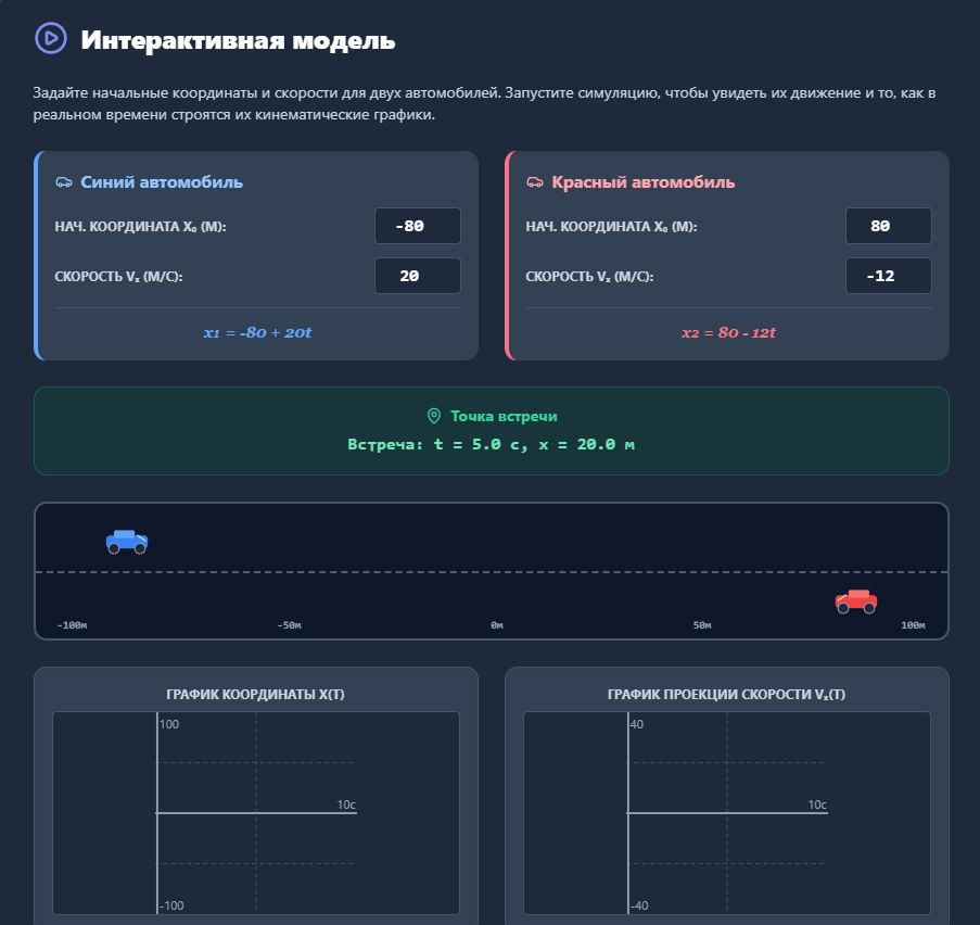 файл идет в формате html скидываете детям, состоит из 2 разделов теория с интерактивным инструментом который в реальном времени по вашим параметрам (скорости и начальной координаты) рисует графики в конце есть тест для закрепления тест состоит из базовых повышенных и заданий ЕГЭ по данной теме, в файл вложена защита от списывания, запрет копирования вставки, счетчик сколько раз ребенок переключал вкладки