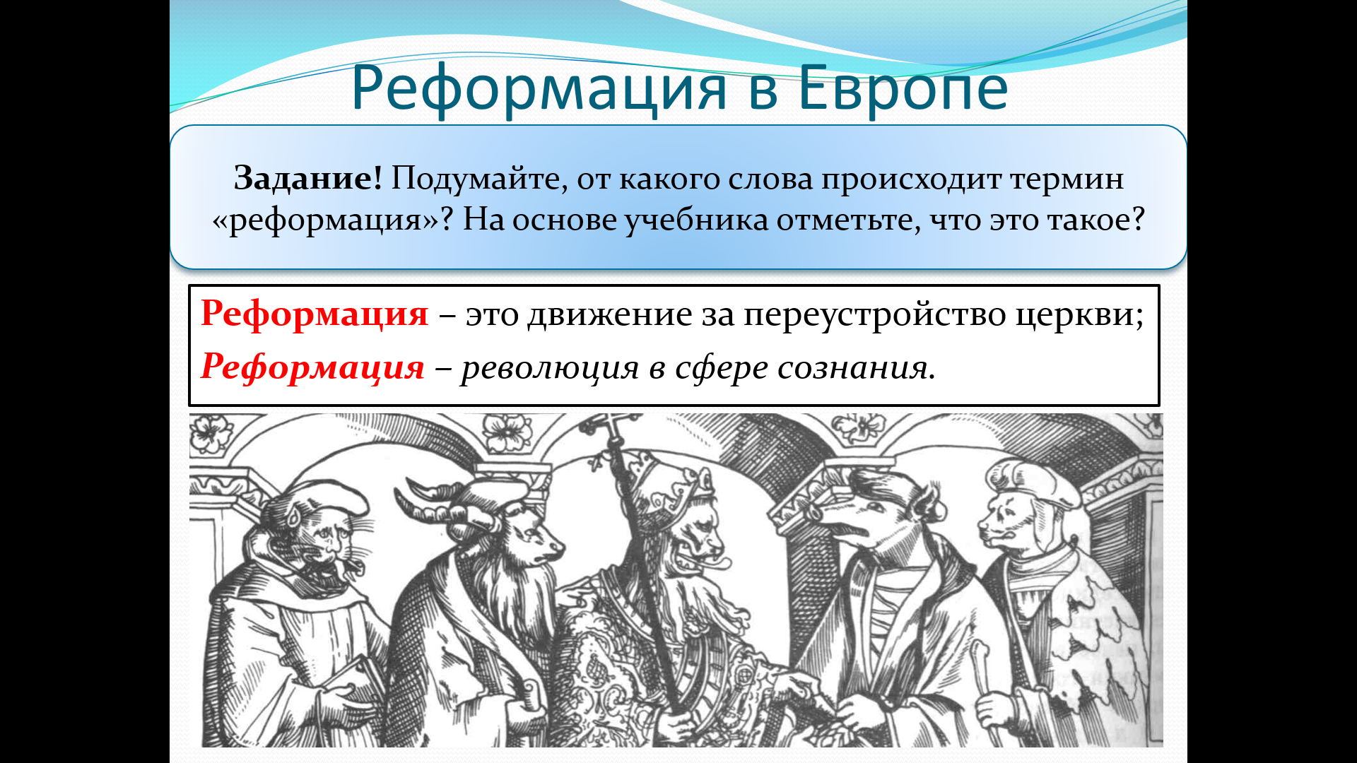Цель: Сформировать у учащихся представление о Реформации как революции в сфере сознания и её последствиях для европейского общества.