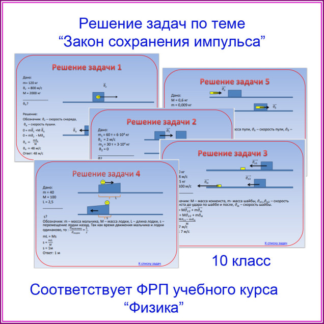 Презентация по теме "Закон сохранения импульса" предназначена для 10 класса. Рассматриваются решения пяти задач по данной теме с рисунками и расчетами. На слайде "Содержание" представлен список задач и гиперссылки на слайды с условиями и решениями.