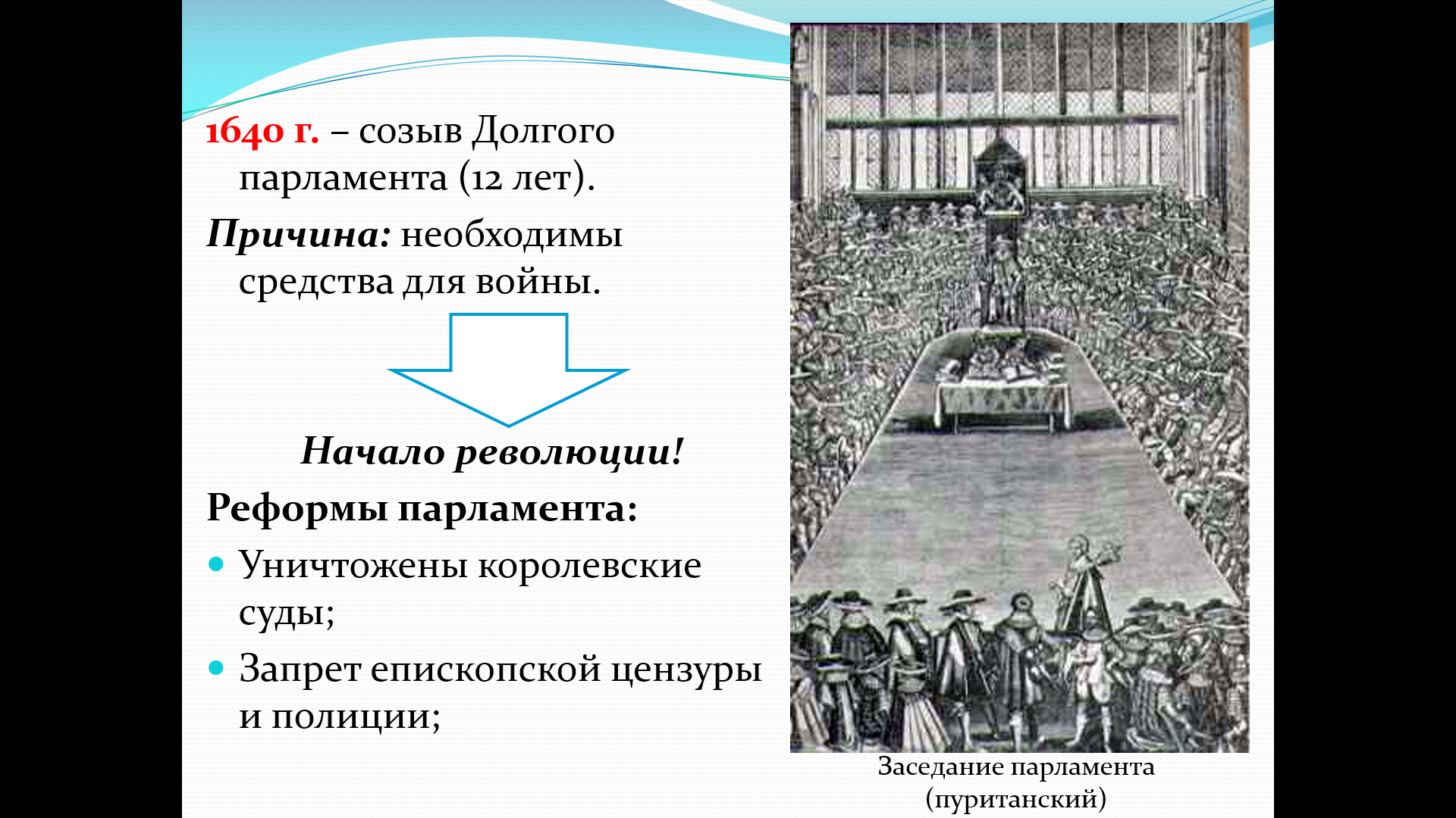 Цель: Сформировать у учащихся представление о причинах, ходе и итогах Английской революции как важнейшем этапе становления парламентской демократии.