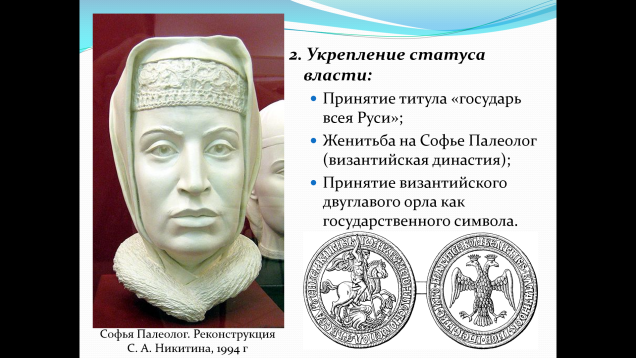 Показать укрепление статуса великого князя: принятие титула «государь всея Руси», женитьба на Софье Палеолог, принятие двуглавого орла.