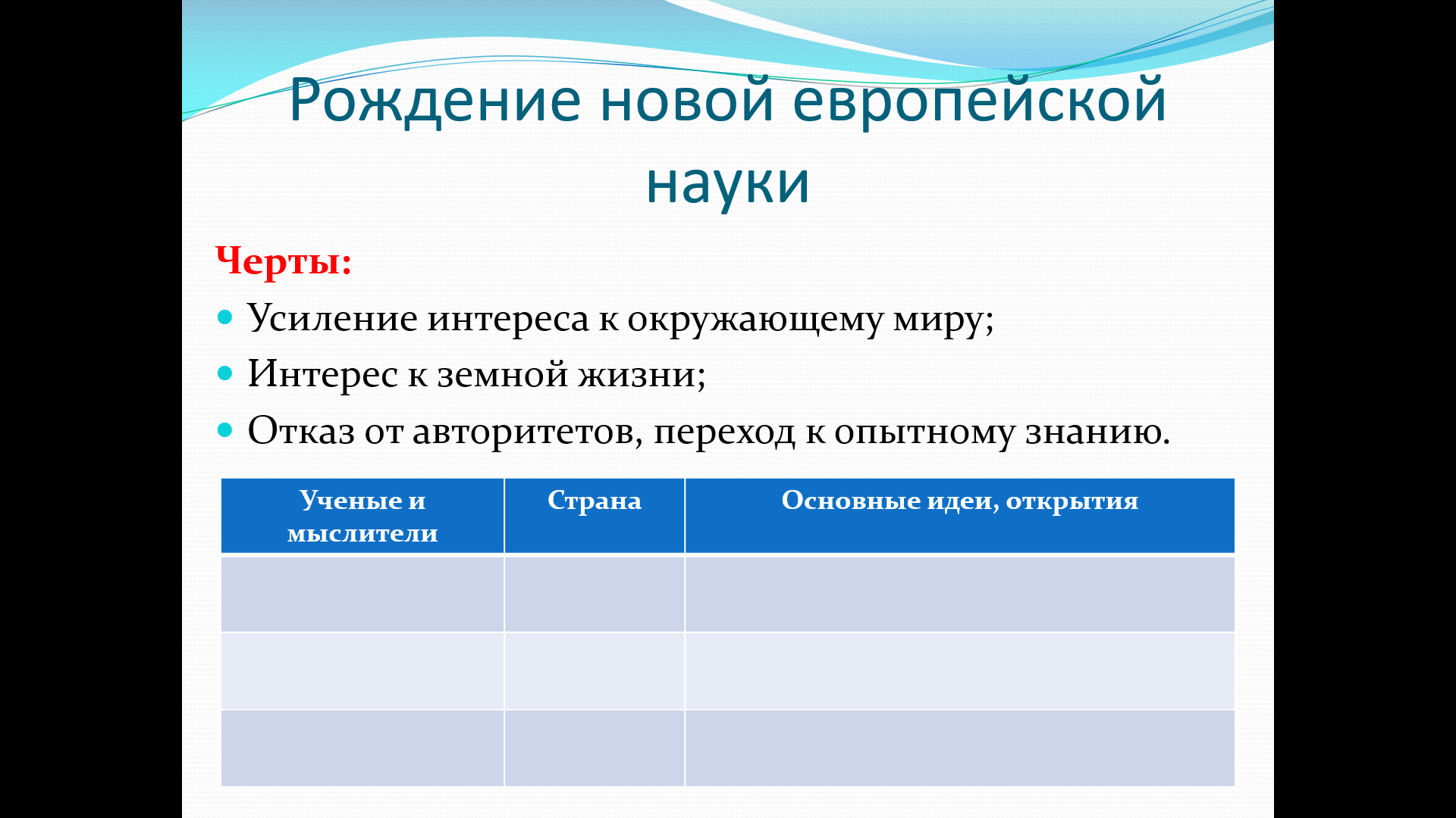 Раскрыть основные черты новой науки: интерес к окружающему миру, отказ от авторитетов, переход к опытному знанию.