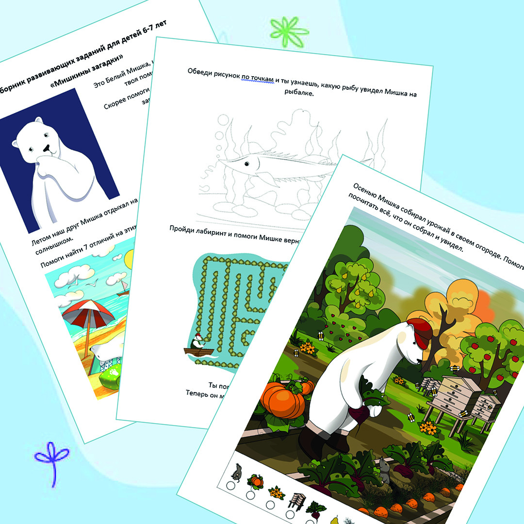 Этот сборник создан в игровой форме и помогает ребёнку развивать внимание, мышление и подготовиться к школе. Главный герой заданий — Белый Мишка, который отправляется в небольшое путешествие и предлагает ребёнку помочь ему решить различные загадки и задания.