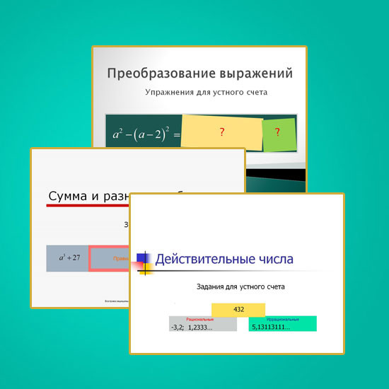 Упражнения для устного счета к урокам математики для 7-9 классов разрабатывались с учетом следующих принципов: применение простых и понятных формулировок заданий; наглядность; небольшие затраты времени (3-5 мин) на проведение; возможность проверки и объявления результатов на уроке с последующей коррекцией ошибок. Упражнения наглядны, разнообразны по форме проведения. Анимация, применяемая в них, позволяет понять вопрос и правильно на него ответить.