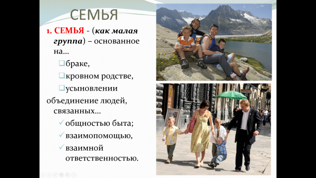 Семья как малая группа (брак, кровное родство, усыновление, общность быта, взаимопомощь)