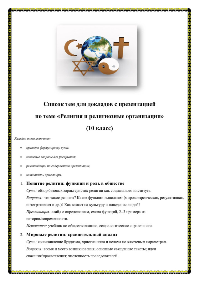 В методической разработке представлен перечень 15 примерных тем для подготовки рефератов и докладов обучающимися 10 класса по предмету обществознание на тему "Религия и религиозные организации".