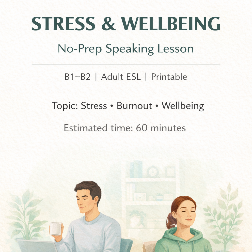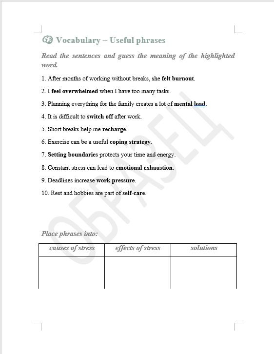 Готовый разговорный урок по теме стресса, эмоционального выгорания и благополучия для взрослых студентов уровня B1–B2.