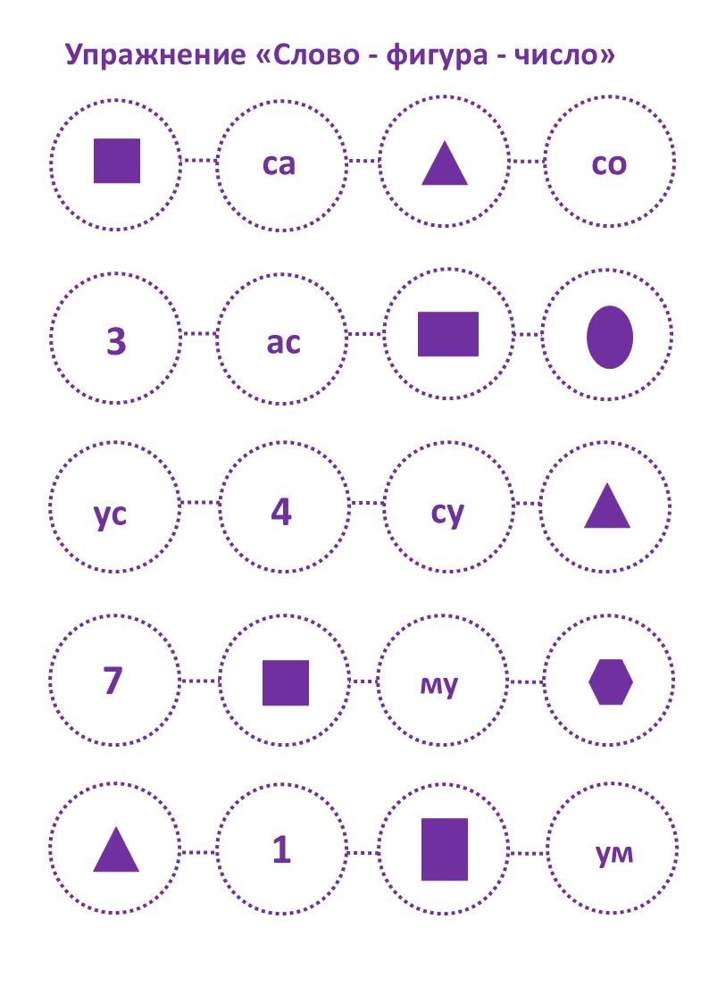Упражнение «Слово-фигура-число» для скорочтения – это метод развития концентрации и скорости чтения, где участник быстро называет слева направо элементы в строке, включающей слова, геометрические фигуры и числа, чтобы довести узнавание до автоматизма и улучшить движение глаз, что тренирует внимание и скорость восприятия.