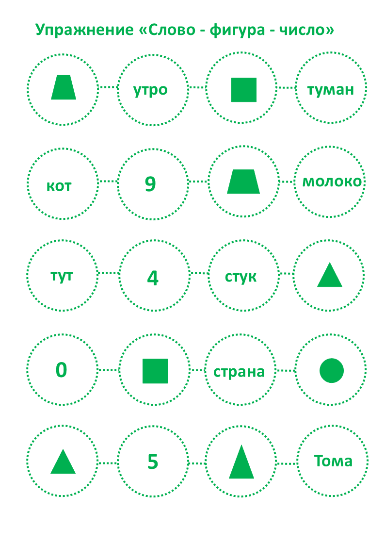 Упражнение «Слово-фигура-число» для скорочтения – это метод развития концентрации и скорости чтения, где участник быстро называет слева направо элементы в строке, включающей слова, геометрические фигуры и числа, чтобы довести узнавание до автоматизма и улучшить движение глаз, что тренирует внимание и скорость восприятия.