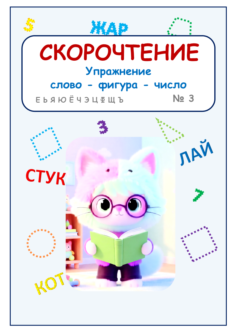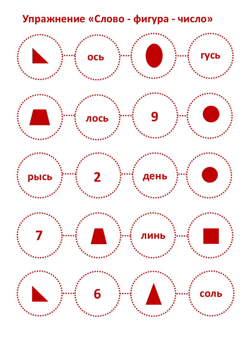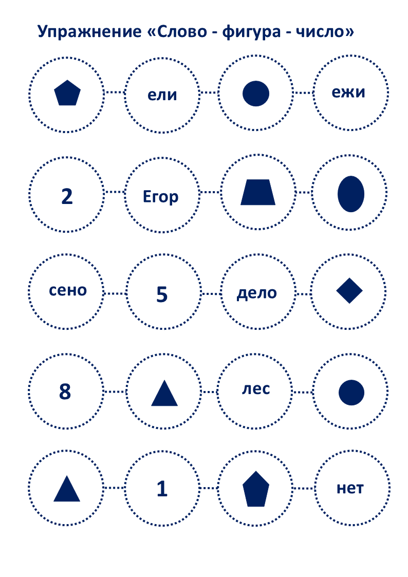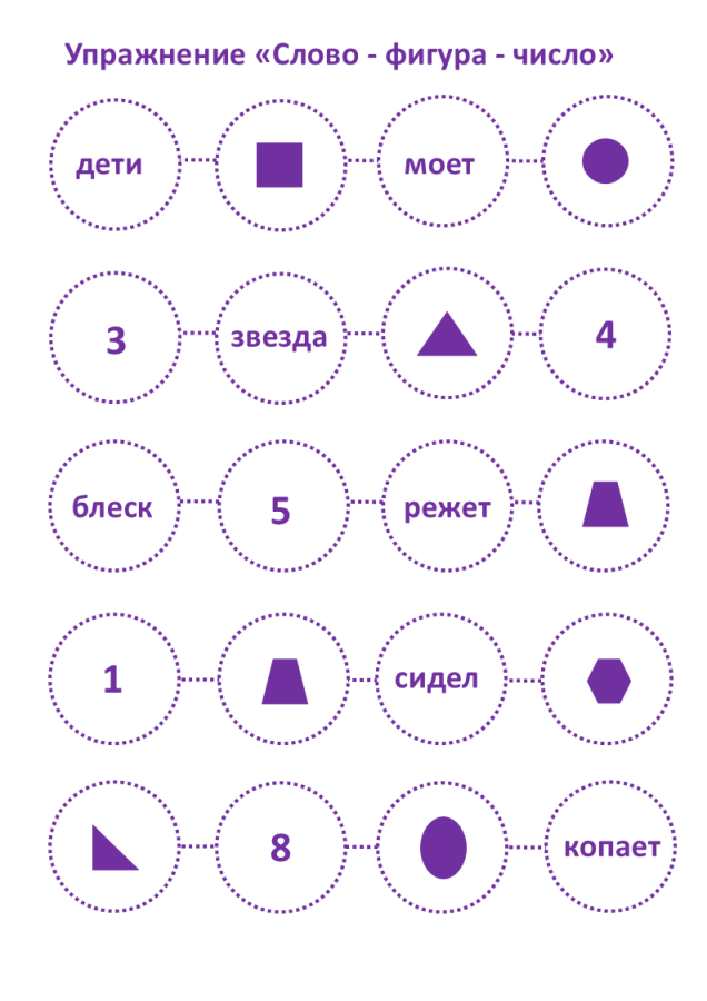 Упражнение «Слово-фигура-число» для скорочтения – это метод развития концентрации и скорости чтения, где участник быстро называет слева направо элементы в строке, включающей слова, геометрические фигуры и числа, чтобы довести узнавание до автоматизма и улучшить движение глаз, что тренирует внимание и скорость восприятия.