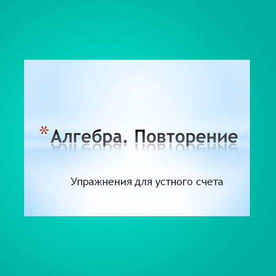 Упражнения для устного счета по теме "Алгебра. Повторение" выполнены в формате "PowerPoint". Применяются на первых уроках алгебры и начала анализа в 10 классе для повторения основных тем основной школы.