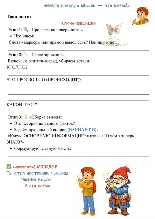 А ты знаешь, кто такие Скелетоны? 🦴 Скелетоны — это повелители смыслов. Они научат тебя легко находить главную мысль в любом тексте. 📘 Я создала пособие для ребят 2–4 классов, которое учит ребёнка: ✔ убирать лишнее ✔ видеть «скелет» текста ✔ легко формулировать главную мысль 🔑 внутри — волшебный алгоритм 🎨 задания с раскрашиванием, 🎯 подходит для школы, дома и подготовки к 3 заданию ВПР по русскому языку. После занятий дети говорят: «Найти главную мысль — это легко и клёво!» PDF-файл, 7 листов.