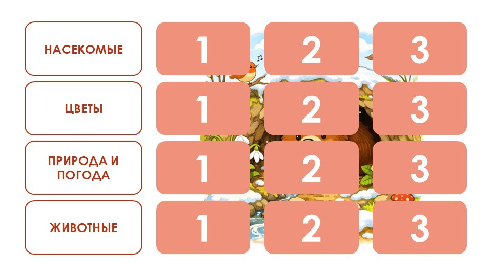 Весенняя викторина для детей дошкольного возраста: 12 вопросов (4 категории) с ответами-иллюстрациями.