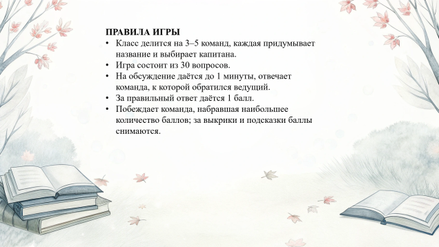 Формат игры: Класс или компания делится на 3–5 команд. У каждой команды есть минута на обсуждение, капитан координирует ответы, а ведущий фиксирует баллы. Атмосфера легкого соперничества, смеха и удивления гарантирована.