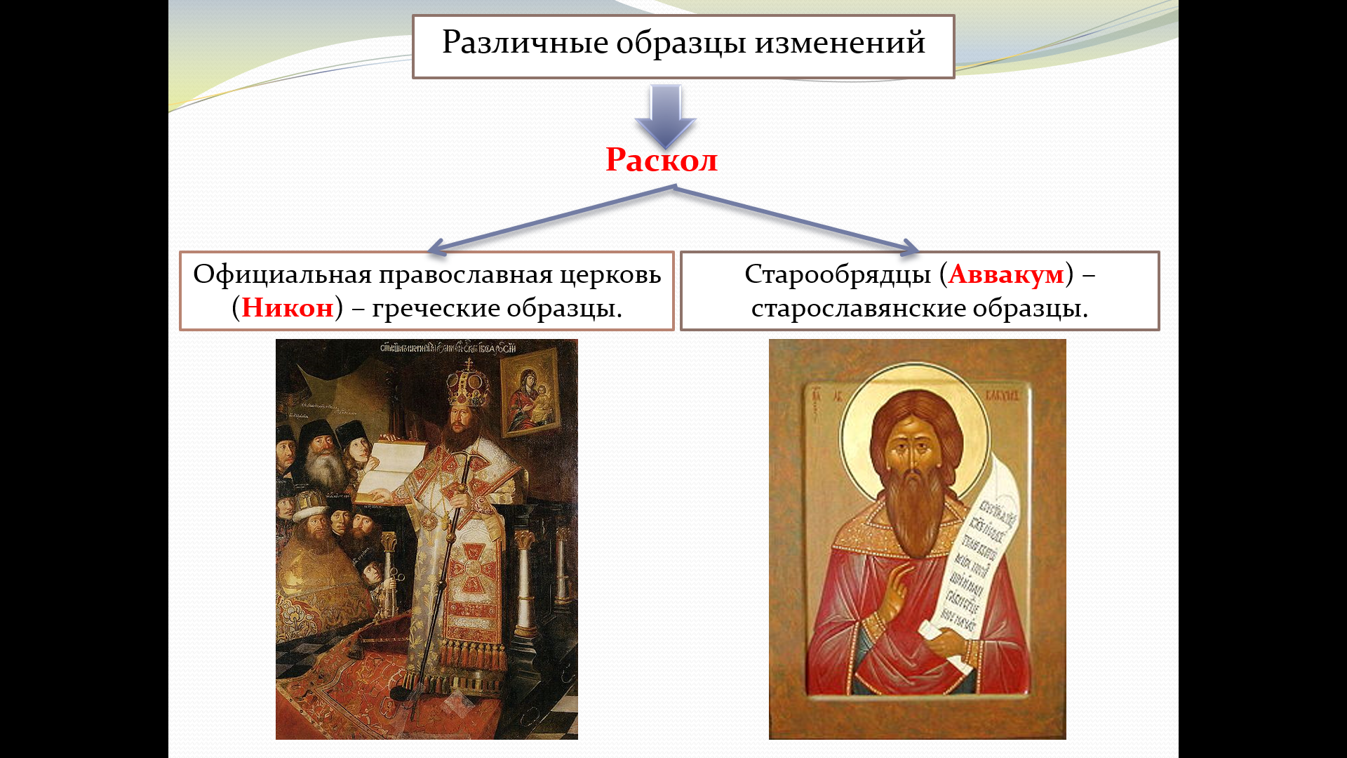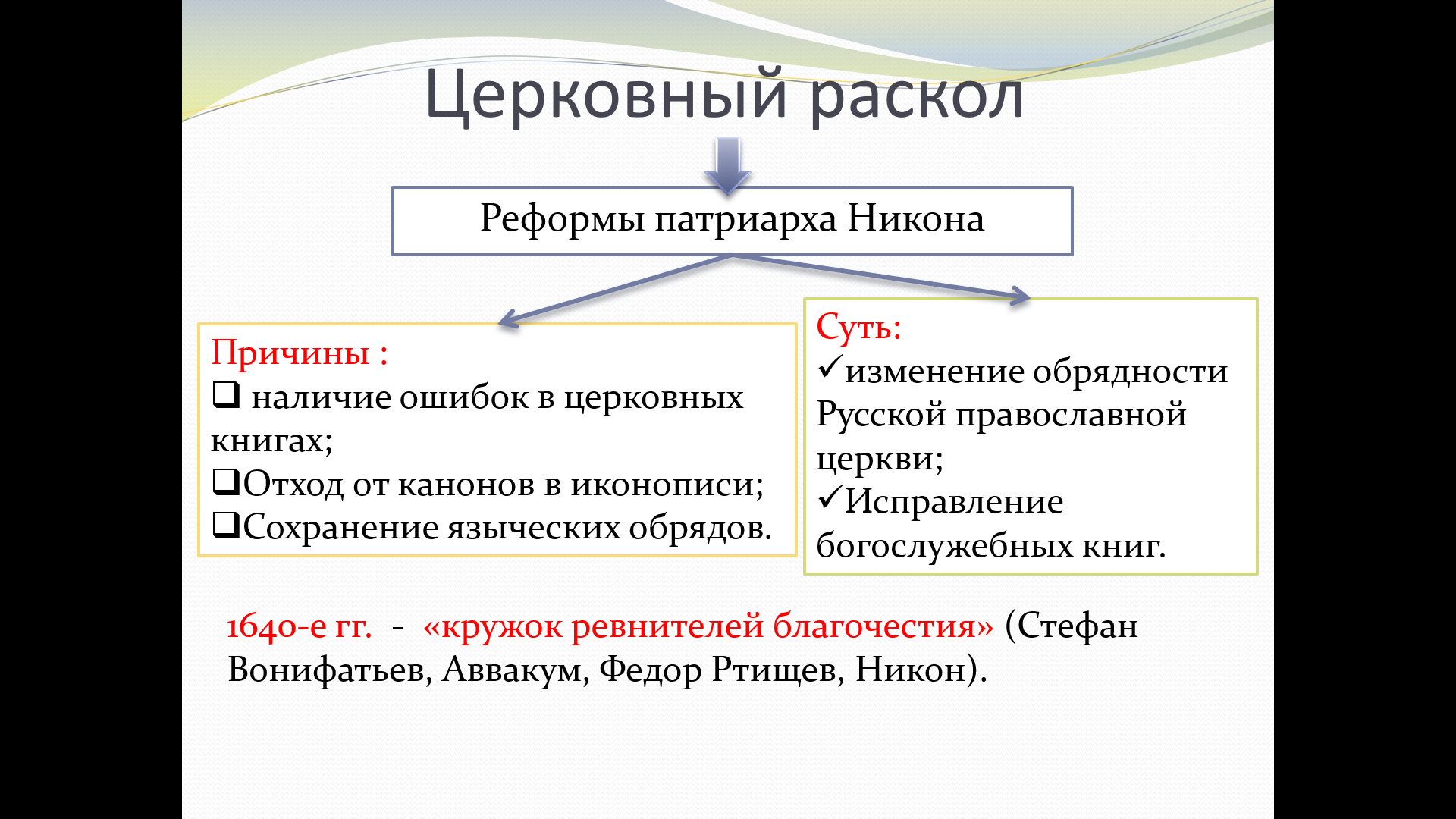 Цель: Сформировать у учащихся представление о церковном расколе как о сложном религиозном и социальном конфликте, его причинах, ходе и последствиях.