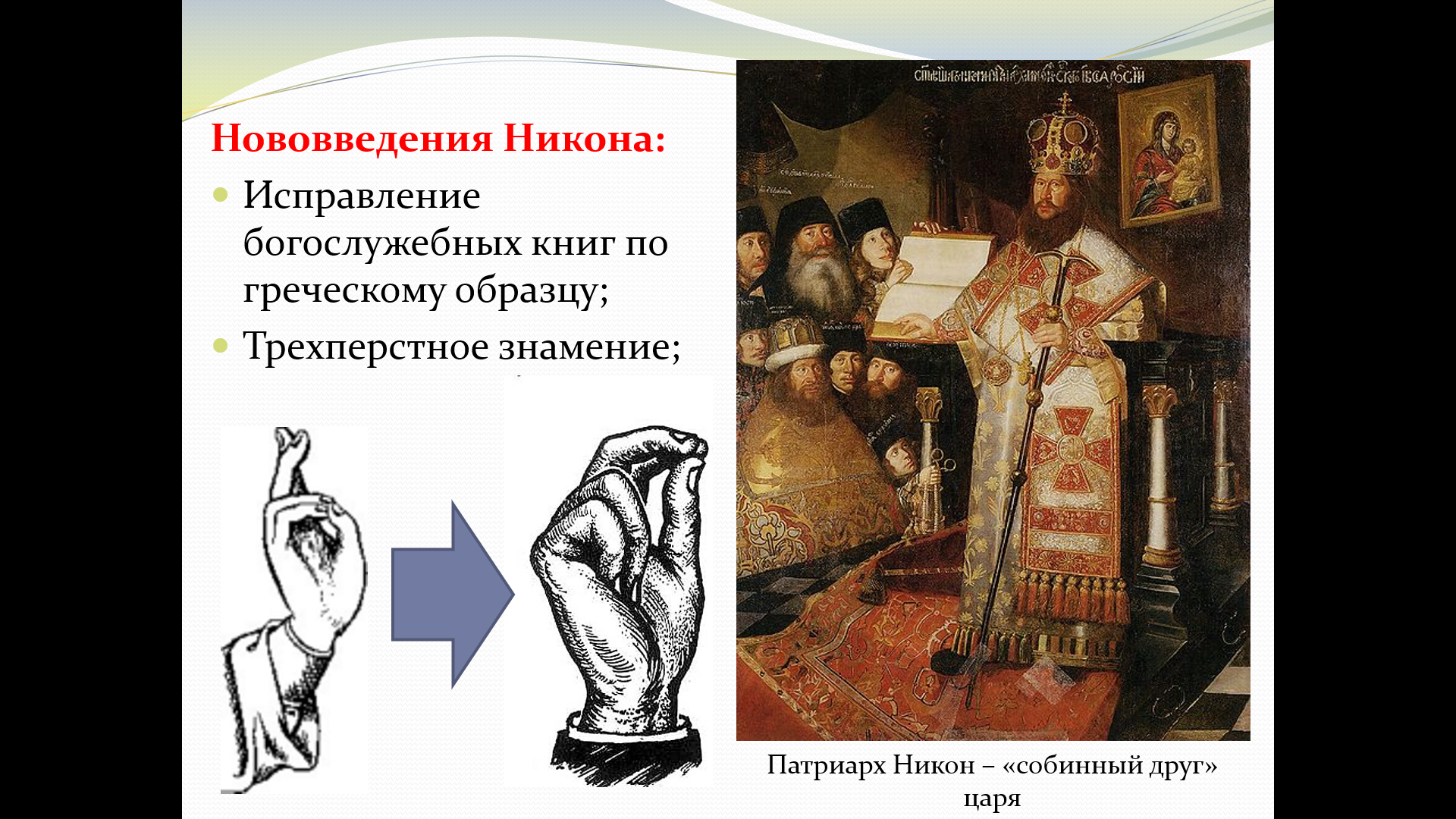 Проанализировать суть реформ патриарха Никона (исправление книг по греческим образцам, изменения в обрядности).