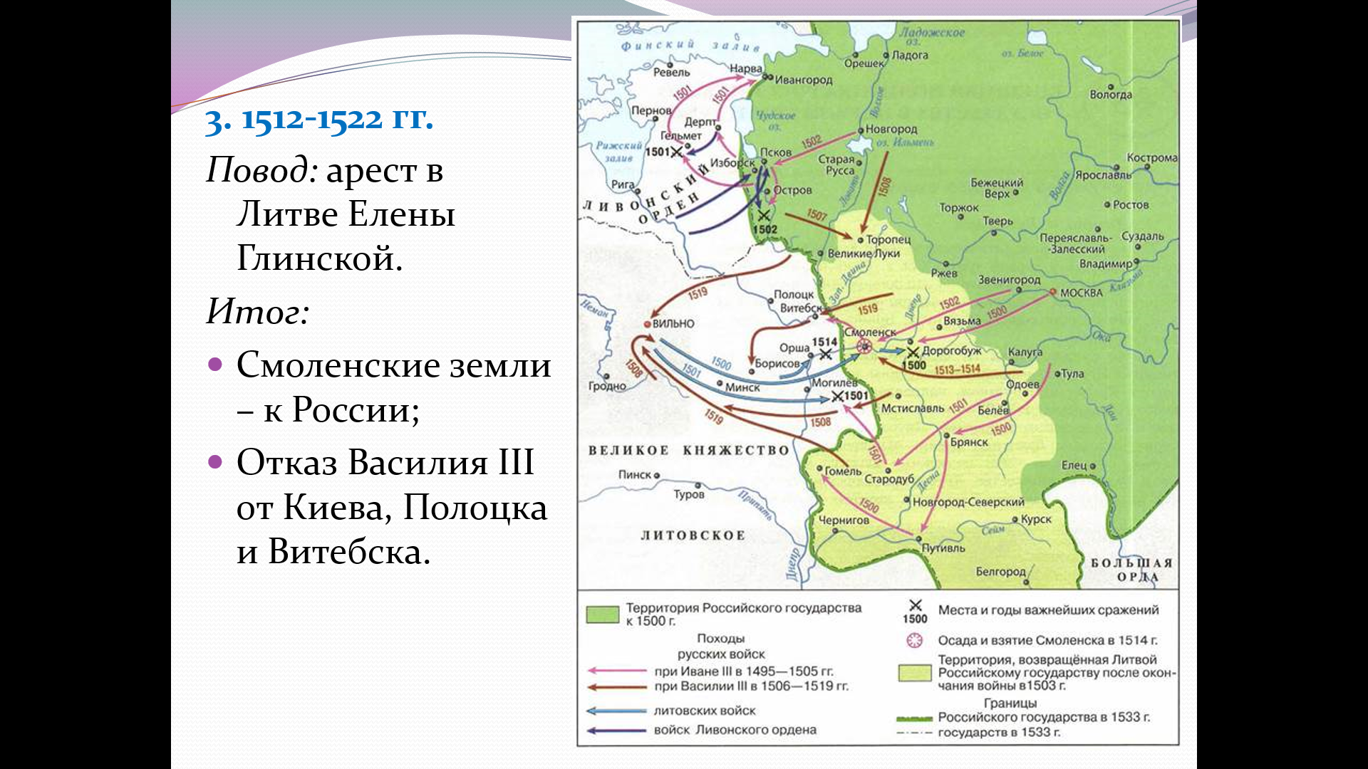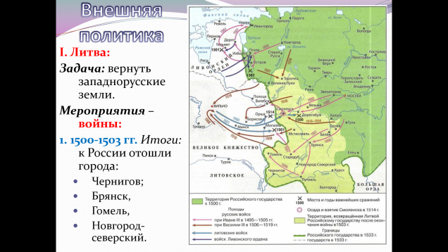 Учащиеся узнают, как Россия возвращала земли, утраченные в период раздробленности, почему война с Литвой растянулась на десятилетия, какую роль в дипломатии сыграл брак Василия III и Елены Глинской, кто такой Максимилиан I и почему переговоры с ним провалились, как Россия защищалась от набегов крымских и казанских татар.