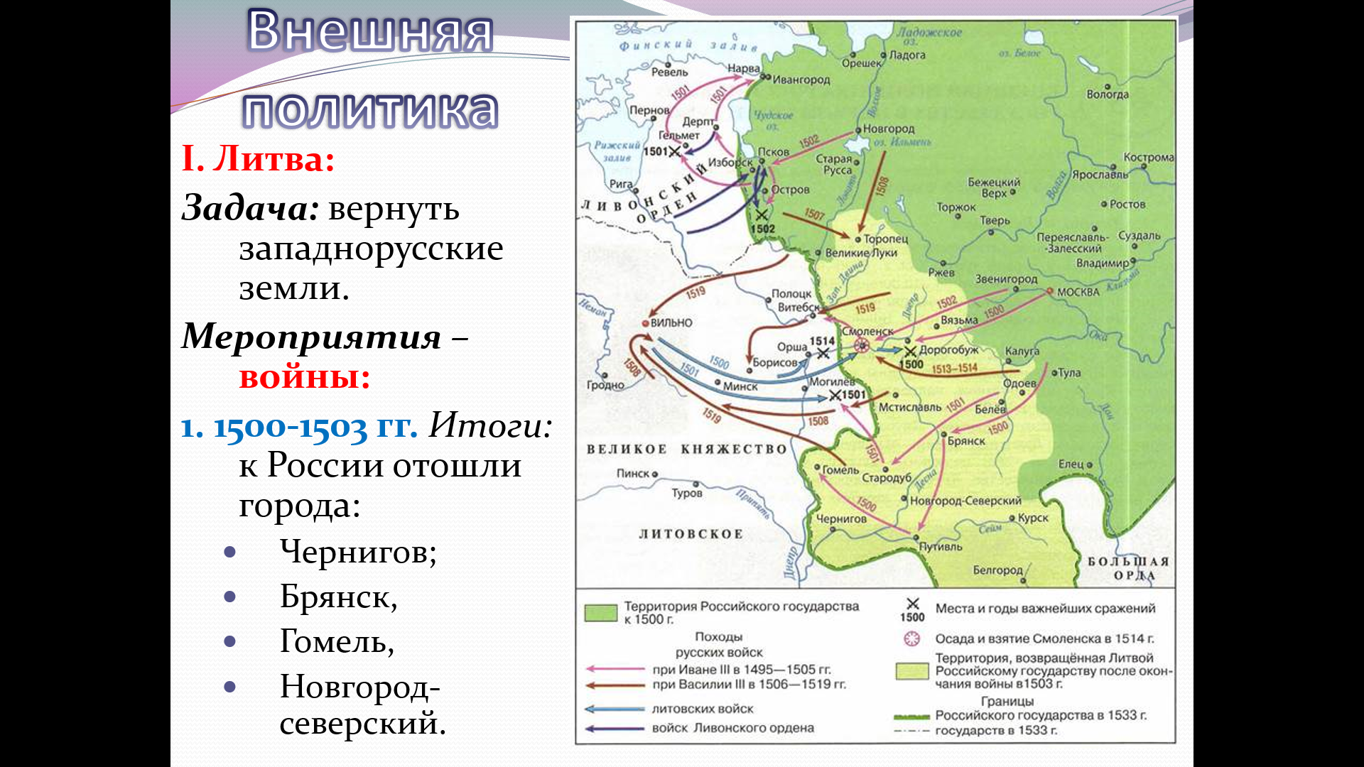 Цель: Сформировать у учащихся представление об основных направлениях внешней политики России в первой трети XVI века и её результатах.