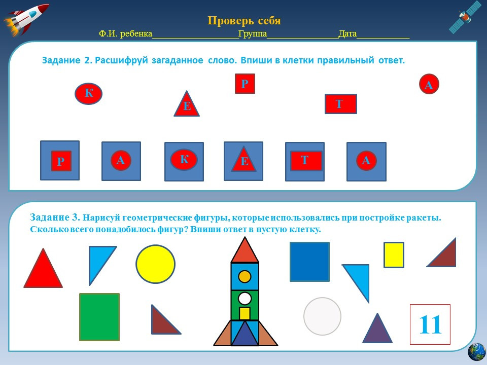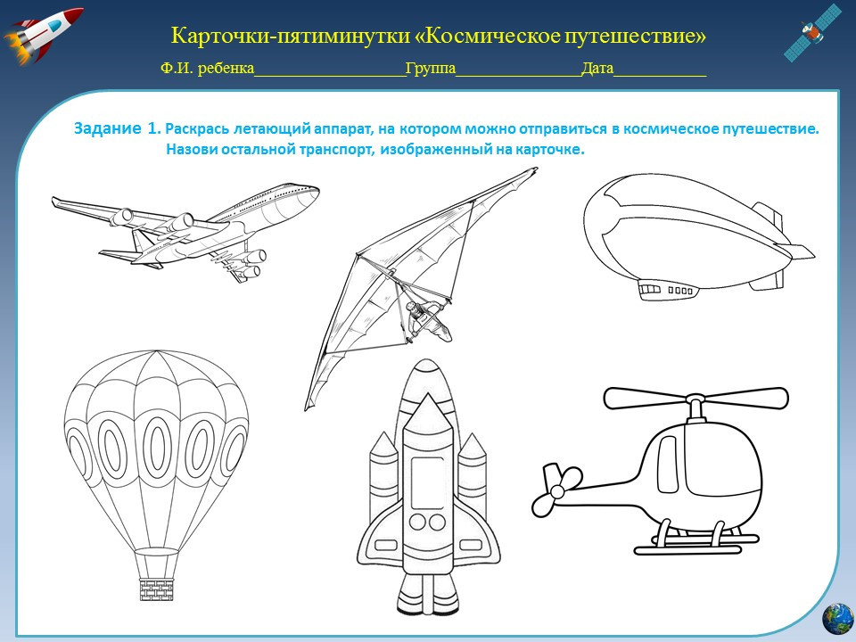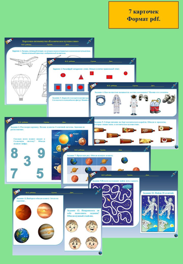 На карточках дети увидят то или иное задание, которое им необходимо будет выполнить ( "Расшифруй загаданное слово", "Собери питание на борт корабля", "Назови элементы скафандра", "Соедини предмет и его силуэт", "Найди отличия", "Продолжи ряд" и т.д.)