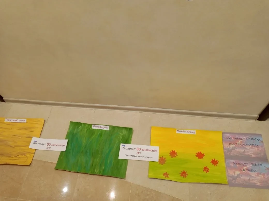 Плакаты с периодами по цветам и с надписями. Раскраски динозавров, живших в разных периодах. Дети их раскрашивают и расселяют по периодам.